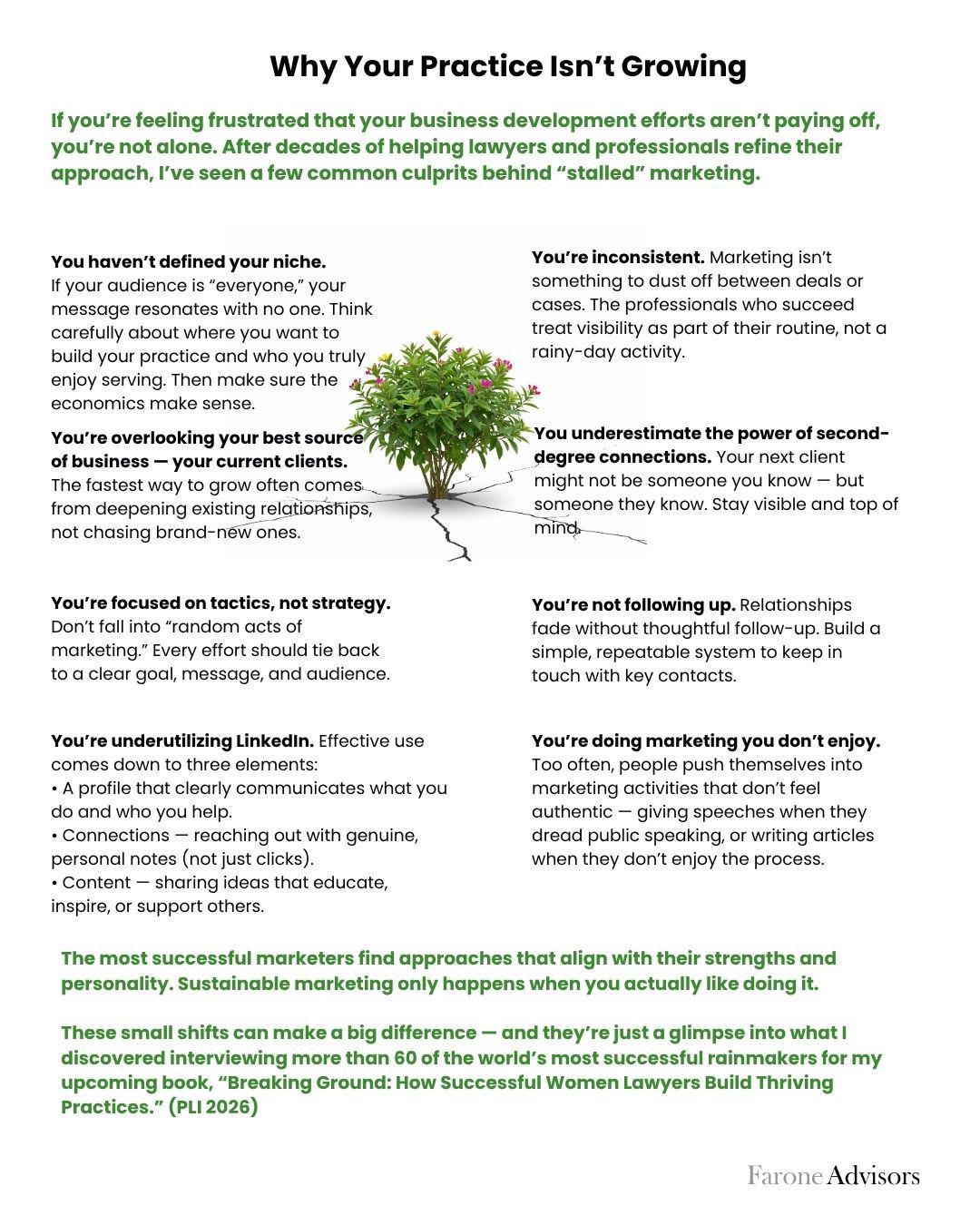For more detail, take a look at the infographic below (adapted from insights in my upcoming book, “Breaking Ground: How Successful Women Lawyers Build Thriving Practices.” (PLI 2026)). Details are available on the PLI website or in the following link.