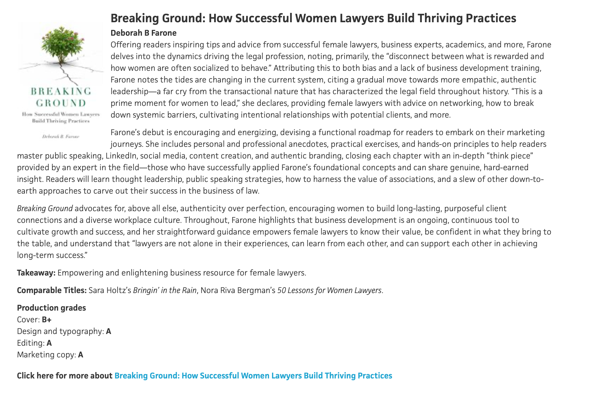“Deborah Farone has hit it out of the park with this book. Bringing to bear her extensive knowledge of the legal and law firm landscape, Deborah has penned a brilliant and, at last, an insightful practical guide for women in the profession. It is full of candor and great tips, written with a liveliness that keeps you eagerly turning more pages. It is a must read for anyone serious about building a successful legal career.”